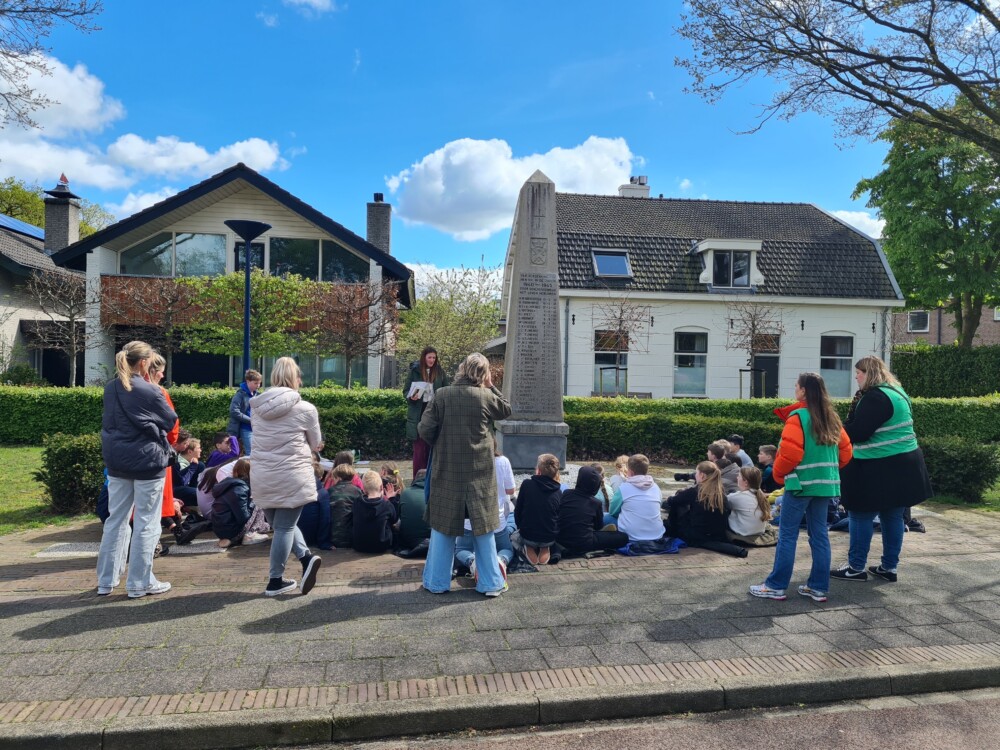 Met groep 8 van basisschool St. Josephschool bij de gedenknaald in Hoogland. We vertellen hier het verhaal achter de namen op het monument.