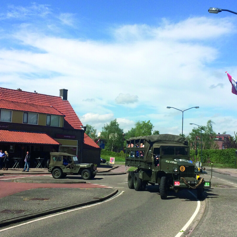 Daar wordt het bevrijdingsvuur ontstoken. Er zijn sprekers en er is muziek. Vanaf De Naald gaan we in een optocht met militaire voertuigen, muziekvereniging Sint Caecilia, deelnemers en bezoekers naar de Berkenlaan- Kerklaan. Van 13.00 – 18.00 uur zijn de legervoertuigen te bezichtigen en rijden deze een route door Hoogland-West met verhalen voor kinderen/ouders.